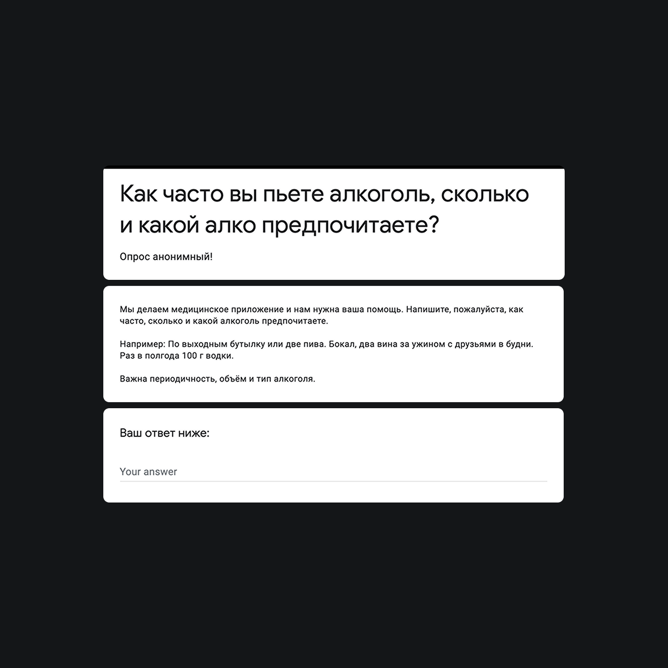 Проблема. Чтобы собрать анамнез, человеку нужно ответить на большое количество вопросов. На некоторые из них очень сложно ответить в анкете, которую составил врач. Например: «Сколько миллилитров алкоголя вы выпиваете, как часто, какой крепости»